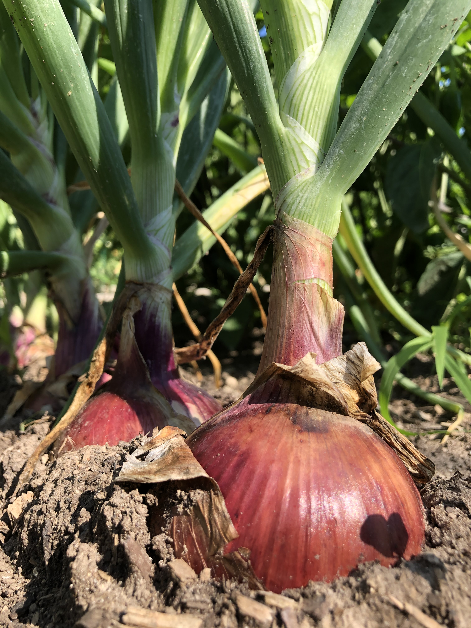 Harvesting onions is as easy as growing them. In July, when the bottom leaves begin to dry up and the stems soften and topple over, I begin my harvest. I simply loosen the soil around the onions and dig them up.