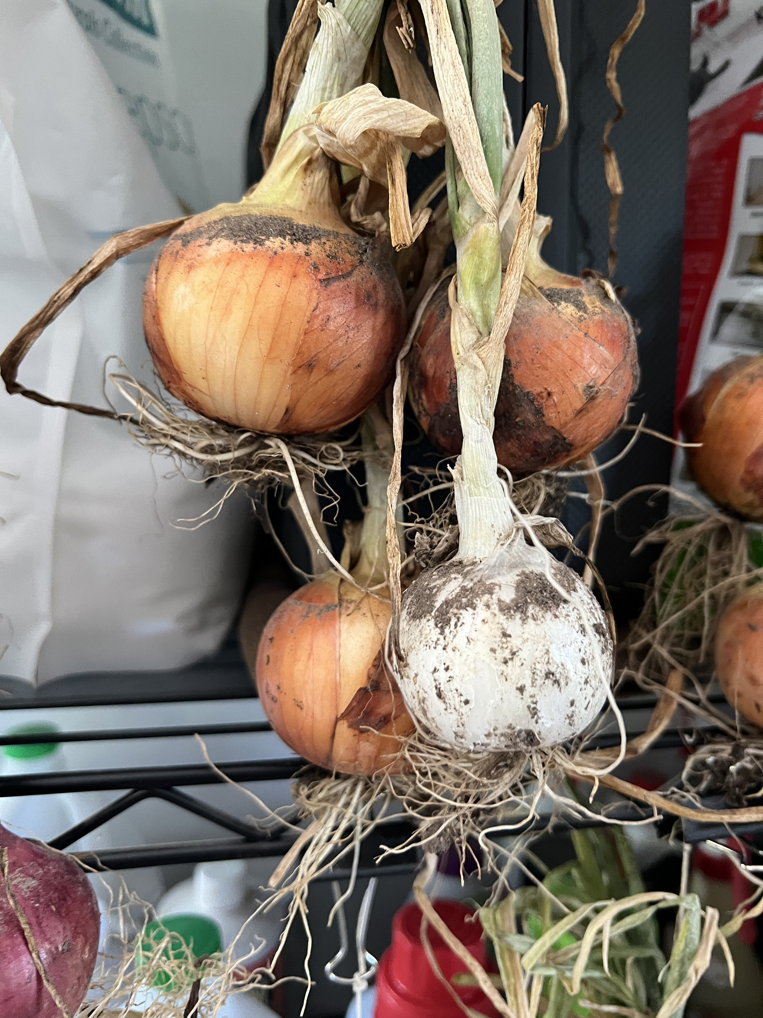 To do this, I either tie them in bunches and hang them or lay them flat on a wire shelf in my warm garage, where the temperature is usually 75-80ºF during the summer months. This makes the space the perfect spot to cure the onions. They stay there for about two weeks until I move them to my 65ºF dry basement, where I will finish the harvest.