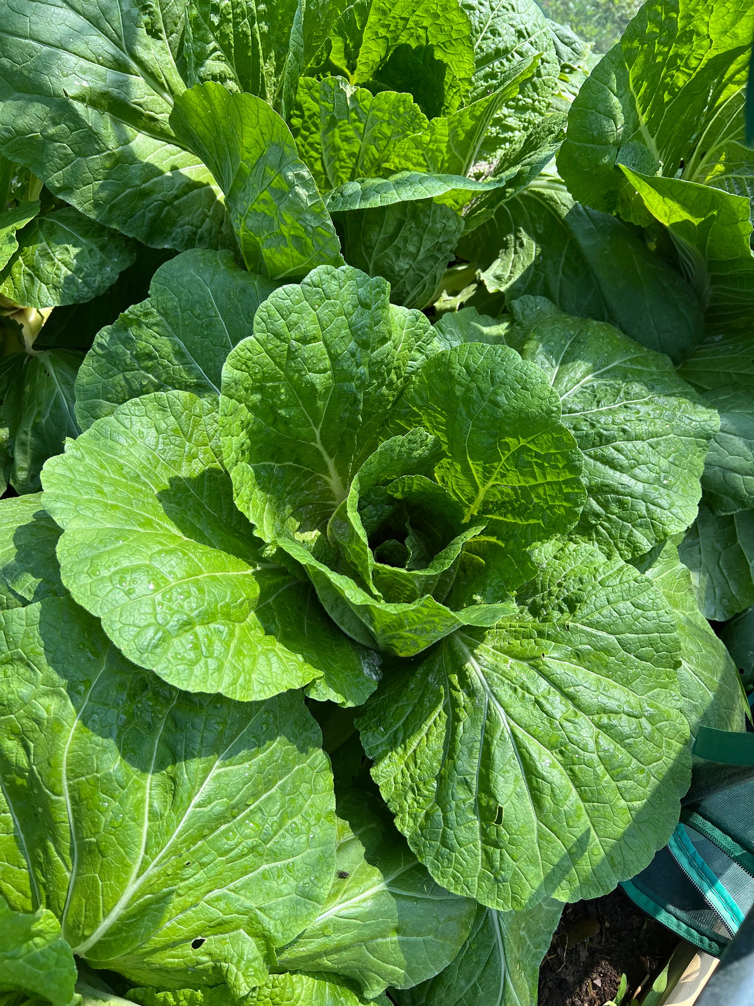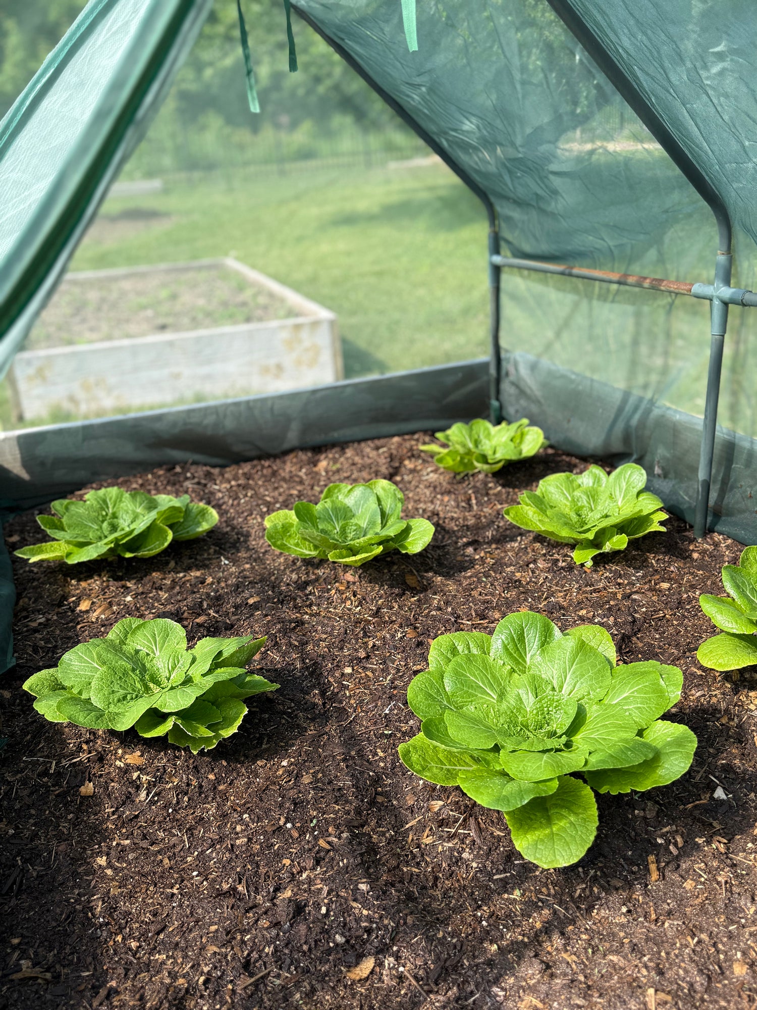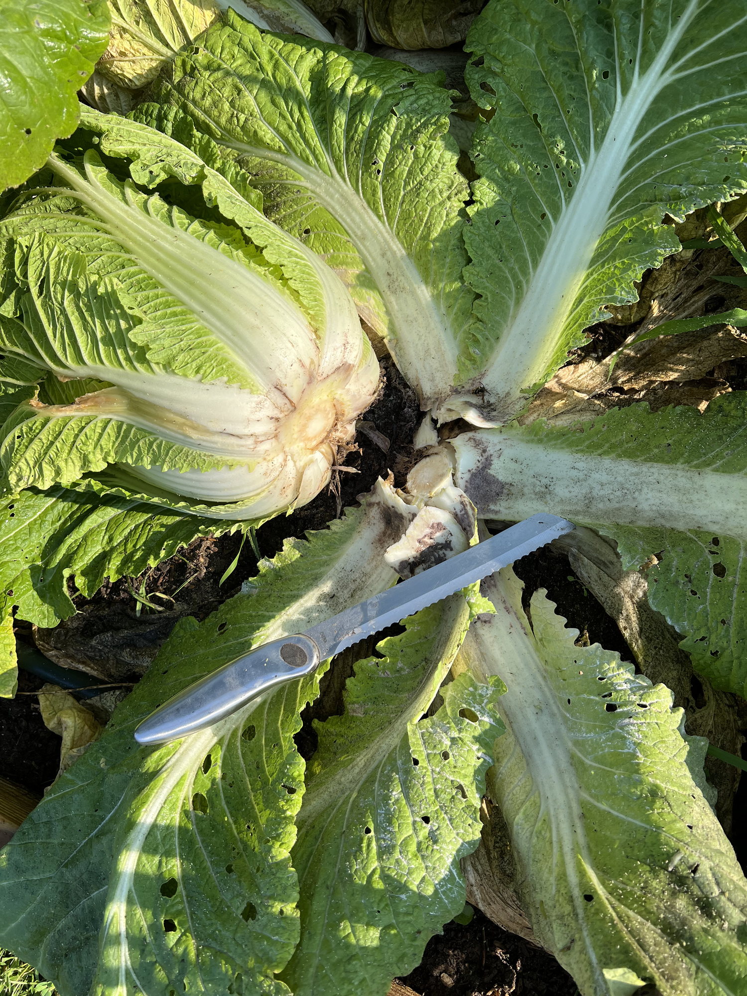 I had tried growing the cabbage without them and was met with an array of leaves skeletonized by the larvae of the cabbage butterfly. The row covers kept them out, and aside from a small battle with earwigs, my second try at growing Napa cabbage was a beautiful success.